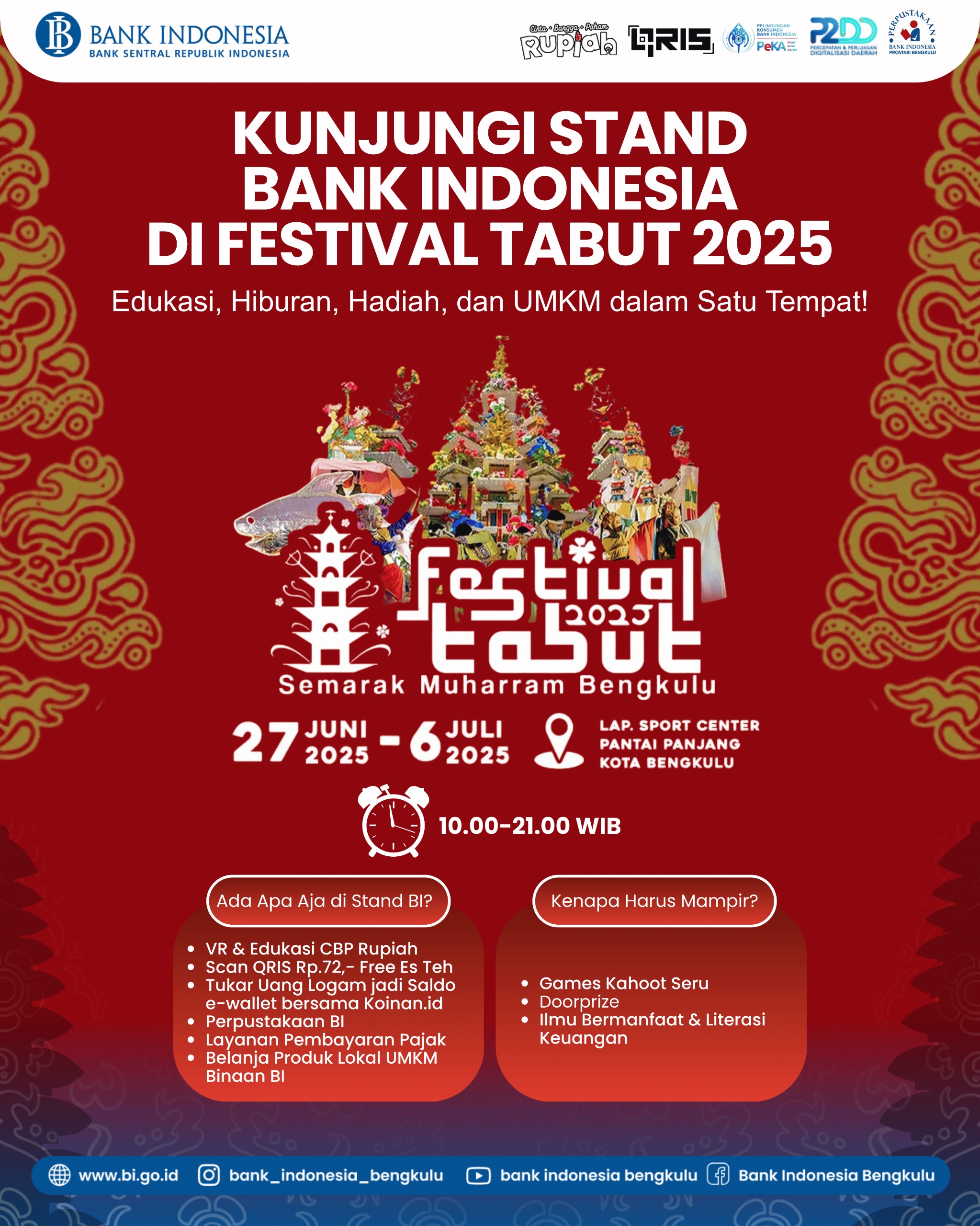 Jadi, jangan lewatkan kesempatan ini! Kunjungi stand BI di Festival Tabut 2025 dan rasakan kombinasi edukasi, digitalisasi, dan ekonomi kreatif dalam satu tempat mulai 27 Juni hingga 6 Juli 2025 di Sport Center Pantai Panjang Bengkulu.