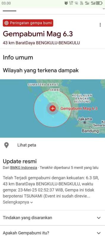 Gempa terjadi di 43 kilometer barat daya Bengkulu dengan kedalaman 10 kilometer Jumat, 23 Mei 2025 sekitar pukul 02.52 WIB. Saat tejadi gempa sempat membuat kepanikan warga karena getaran gempa berlangsung cukup lama.